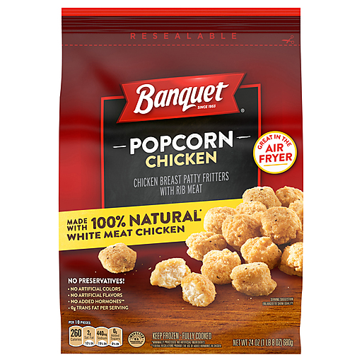 Banquet Popcorn Chicken Frozen Chicken make a quick and easy meal with a kick that your family will love. Chicken breast patty fritters with rib meat, these frozen popcorn chicken are made with 100% natural* white meat chicken. Best of all, this popcorn chicken contains no preservatives, no artificial colors or flavors and no added hormones**. This microwave chicken is ready in minutes. Great for lunches, easy weeknight meals or finger foods at parties, this frozen food heats quickly in a conventional oven for fresh-baked taste or in a microwave for quicker cook time. Keep this resealable 24 ounce bag of breaded chicken frozen meat in the freezer until ready to prepare. in the U.S.A. for over 60 years, Banquet has been making delicious food the whole family loves.