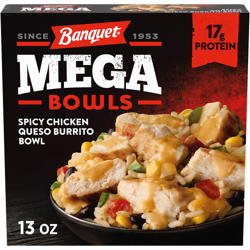 Satisfy your appetite with Banquet MEGA Bowls Spicy Chicken Queso Burrito Bowl. Seasoned chicken breast with spicy queso sauce, white rice, diced bell peppers, tomatoes, onions, corn and black beans make for a simply irresistible microwave meal. This tasty frozen burrito bowl has convenient oven or microwave prep so you can easily enjoy a comforting, spicy chicken burrito meal with 17g protein per serving in a snap. From freezer to table in minutes, these delicious frozen meals are perfect for easy office lunches, quick frozen dinners and more. Banquet MEGA Meals and MEGA Bowls serve up bold flavors for bold appetites in hearty meals.