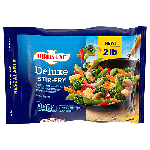Birds Eye Deluxe Stir-Fry is an easy way to add flavorful vegetables to your meals. This delicious ready-to-cook frozen stir-fry vegetable mix features shoestring carrots, broccoli florets, sugar snap peas, red bell peppers, mushrooms and baby corn. These stir-fry veggies come in a resealable bag and pair perfectly with your favorite sauce and protein to give you a tasty meal. Made with nothing artificial, this frozen vegetable blend has quick and easy preparation so you can enjoy Asian-inspired stir-fry vegetables in just a few minutes. Make mealtime easy and delicious by adding Birds Eye frozen vegetables to your recipes.