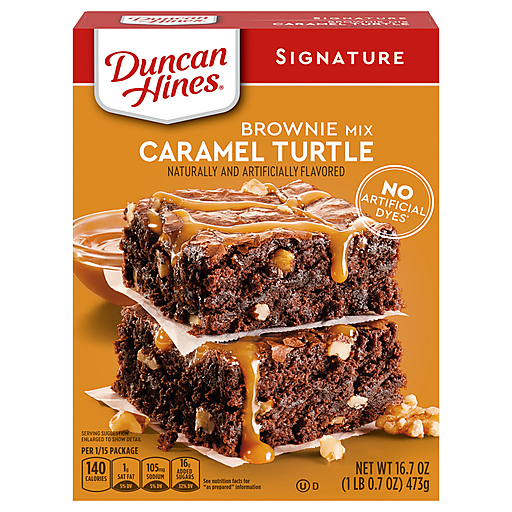 Duncan Hines Signature Caramel Turtle Brownie Mix makes rich and chewy brownies with real California walnuts and rich caramel topping that are sure to become a family favorite. The smooth and velvety brownie batter makes it easy to bake perfect fudge brownies every time. Simply add water, egg and vegetable oil to the baking mix and stir to combine. Pour into a pan and bake for the recommended time in the instructions. Prepare this brownie mix to make decadent brownies with frosting or drizzle with caramel for extra special desserts. You can also use it to make fun creations like brownie bites that make great snacks and treats for sharing. This boxed brownie mix fills one 8 x 8 or 9 x 9 inch baking dish. From decadent baked goods to delicious frostings and fillings, Duncan Hines has you covered when you're ready to bake and create. Bake someone happy!