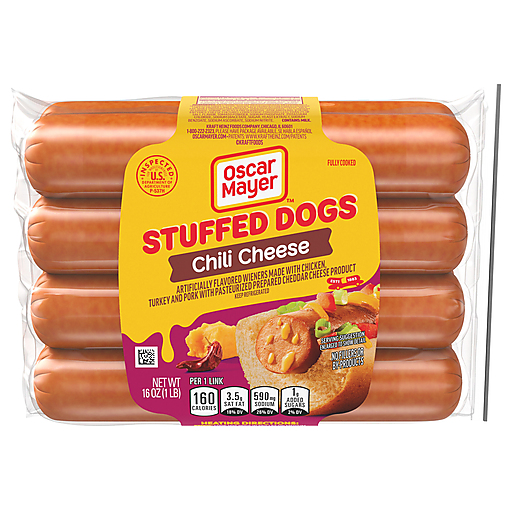 Grill up gooey goodness with Oscar Mayer Chili Cheese Stuffed Dogs. Filled with flavor, our stuffed dogs feature artificially flavored wieners made with chicken, turkey and pork with pasteurized prepared cheddar cheese product. Our fully cooked, savory stuffed hotdogs contain 7 grams of protein per serving and are ideal for quick preparation and consistent flavor. Easily prepare our chili cheese hotdogs on the stove or in the microwave for deliciousness stuffed in every bite. Oscar Mayer Stuffed Dogs are made in the USA and contain no fillers or by-products. Keep our 16-ounce, 8-count pack of chili cheese-filled hotdogs in the refrigerator until ready to prepare. Dig into deliciousness with Oscar Mayer Chili Cheese Stuffed Dogs.