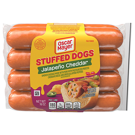 Grill up gooey goodness with Oscar Mayer Jalapeño Cheddar Stuffed Dogs. Filled with flavor, our stuffed dogs feature smoked sausage made with pork with pasteurized process cheddar cheese and dried jalapeño peppers. Our fully cooked, savory stuffed hotdogs contain 7 grams of protein per serving and are ideal for quick preparation and consistent flavor. Easily prepare our cheesy jalapeño stuffed dogs on the stove or in the microwave for deliciousness stuffed in every bite. Oscar Mayer Stuffed Dogs are made in the USA and contain no fillers or by-products. Keep our 16-ounce, 8-count pack of jalapeño cheese-filled hotdogs in the refrigerator until ready to prepare. Dig into deliciousness with Oscar Mayer Jalapeño Cheddar Stuffed Dogs.